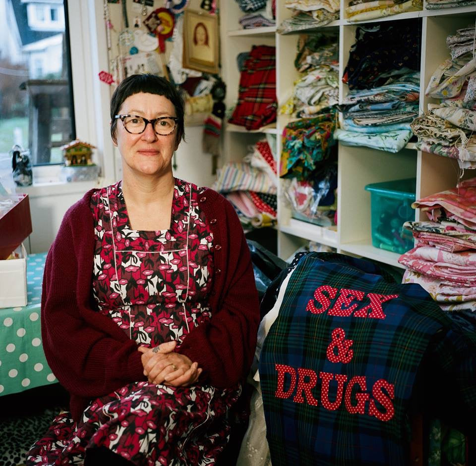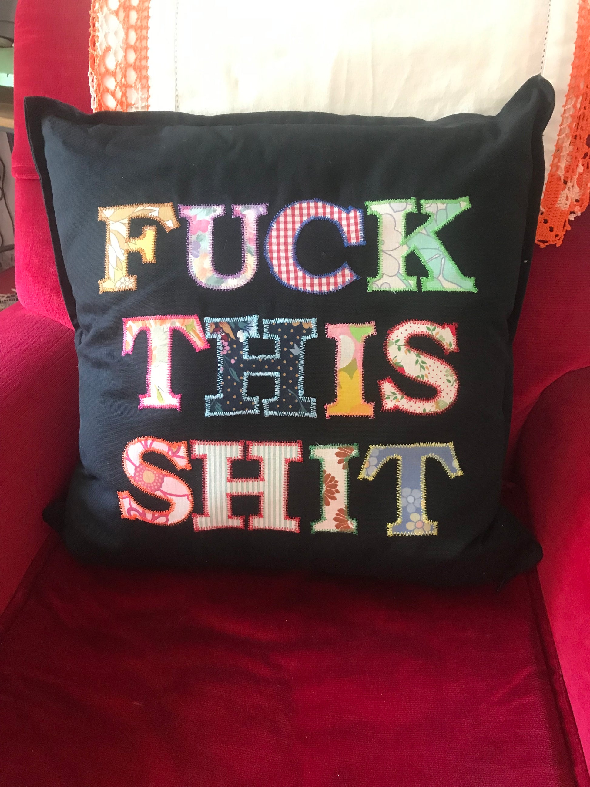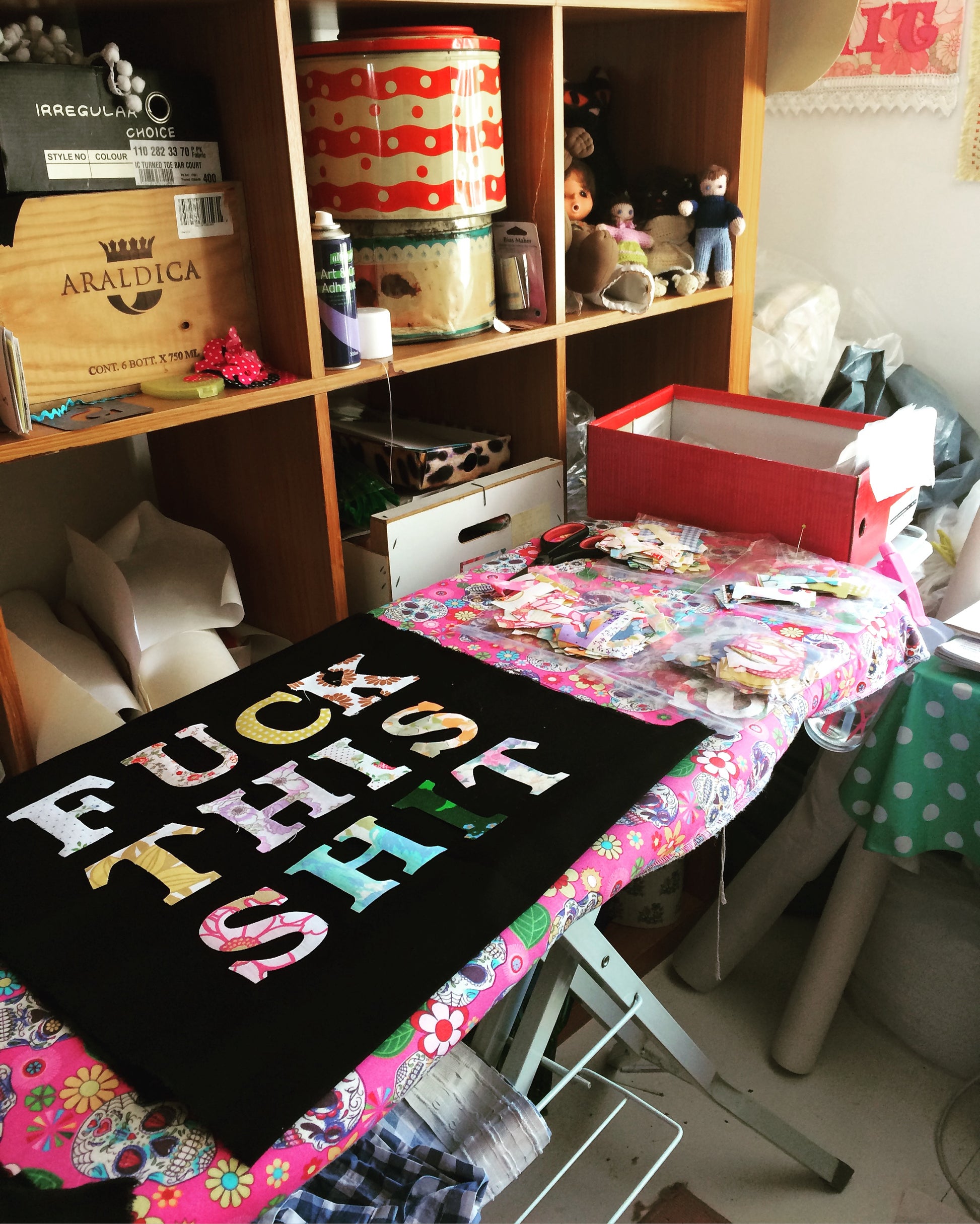 Black cotton, with appliquéd, recycled floral fabrics sweet enough to fool your nan - until you clock the words: FUCK THIS SHIT